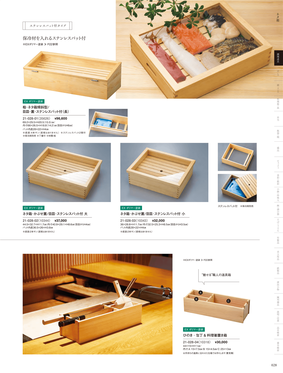 | 21-028-01 | 桧・ネタ箱傾斜型(長)/目皿・蓋・ステンレスバット付 | 上代 96,600円(税抜) 卸値 63,756円(税抜) (34%OFF) | ||