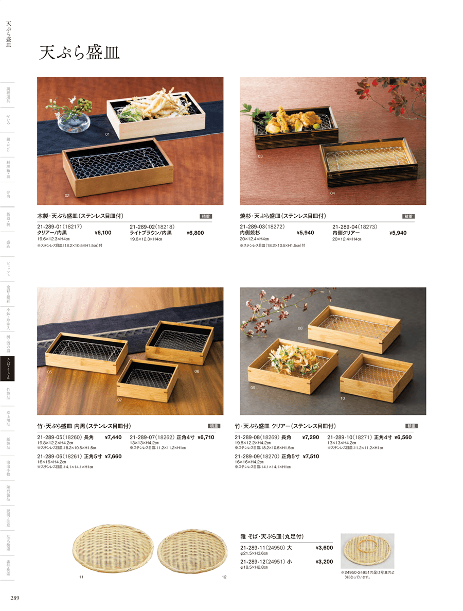 | 21-289-08 | 竹・天ぷら盛皿クリアー ステンレス目皿付 長角 | 上代 7,290円(税抜) 卸値 4,812円(税抜) (34%OFF) | ||