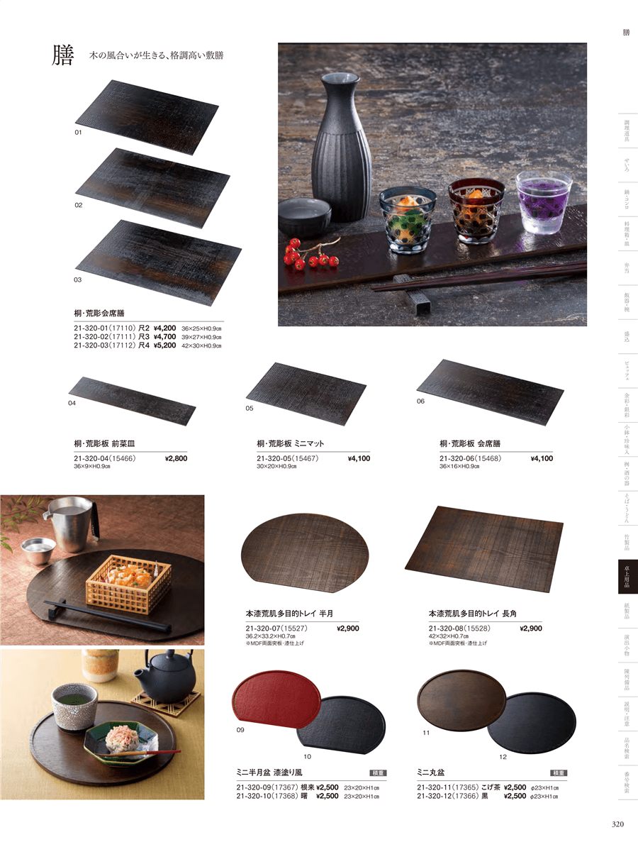 | 21-320-06 | 桐・荒彫板 会席膳 | 上代 4,100円(税抜) 卸値 2,706円(税抜) (34%OFF) | ||