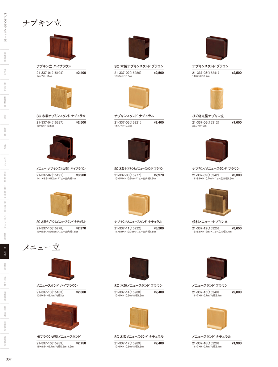 | 21-337-08 | SC木製ナプキン&メニュースタンド ブラウン | 上代 2,970円(税抜) 卸値 1,961円(税抜) (34%OFF) | ||