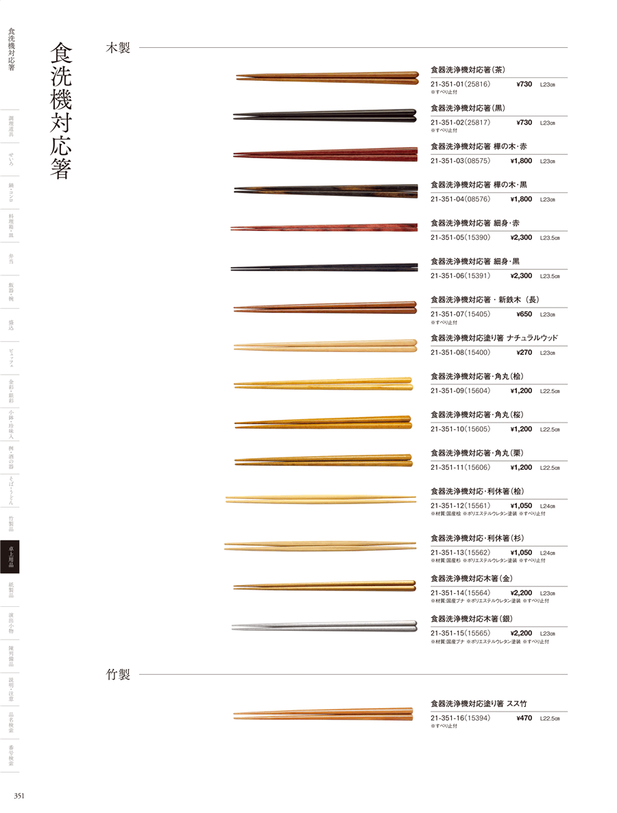 | 21-351-06 | 食器洗浄機対応箸 細身・黒 | 上代 2,300円(税抜) 卸値 1,518円(税抜) (34%OFF) | ||