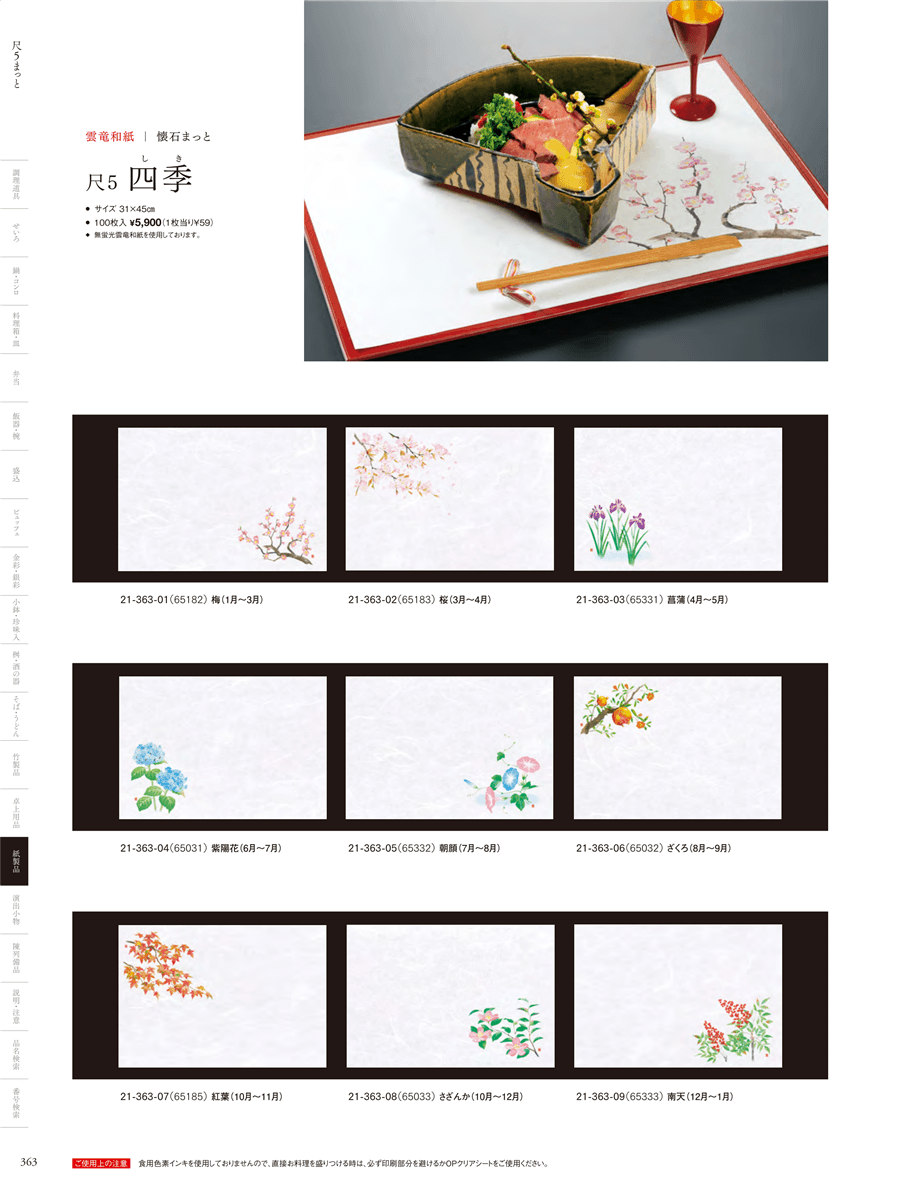 | 21-363-09 | 尺5雲竜和紙懐石まっと 四季 南天 (100枚入) | 上代 5,900円(税抜) 卸値 3,894円(税抜) (34%OFF) | ||