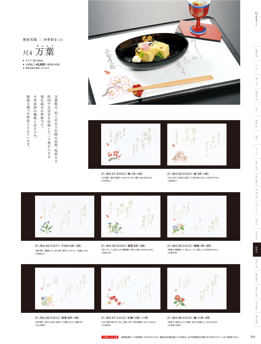 | 21-364-01 | 尺4無蛍光紙懐石まっと 万葉 梅 (100枚入) | 上代 3,500円(税抜) 卸値 2,310円(税抜) (34%OFF) | ||