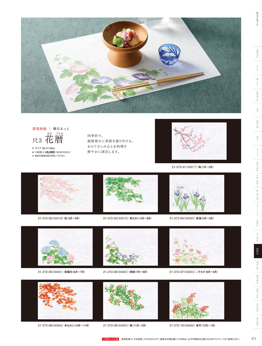 | 21-372-10 | 尺3花暦 懐石まっと 南天 (100枚入) | 上代 3,550円(税抜) 卸値 2,343円(税抜) (34%OFF) | ||