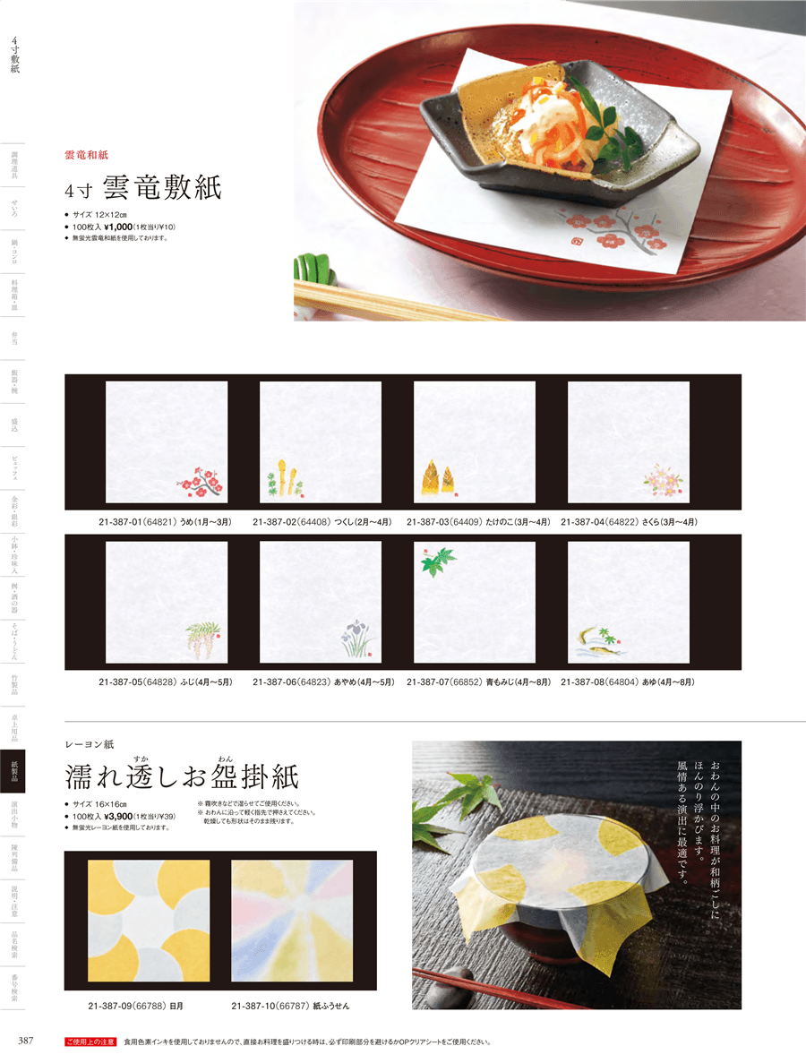 | 21-387-03 | 4寸雲竜敷紙 たけのこ (100枚入) | 上代 1,000円(税抜) 卸値 660円(税抜) (34%OFF) | ||