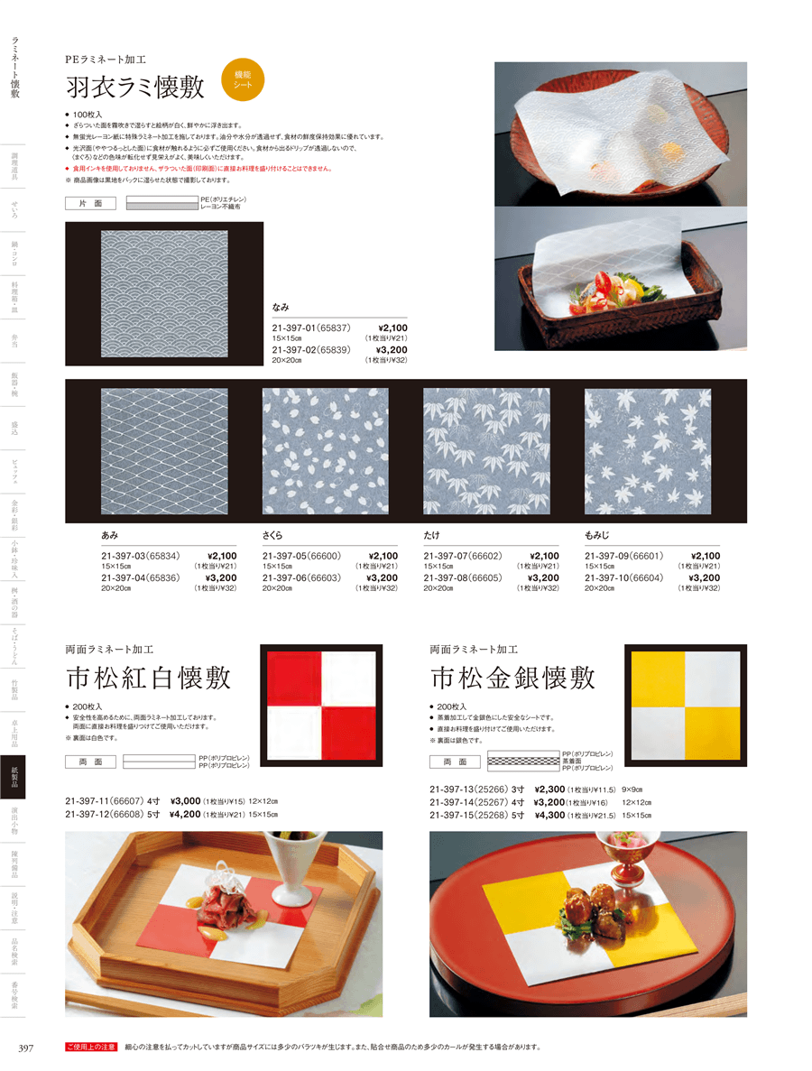 | 21-397-04 | PPラミネート加工 羽衣ラミ懐敷 あみ (100枚入) | 上代 3,200円(税抜) 卸値 2,112円(税抜) (34%OFF) | ||