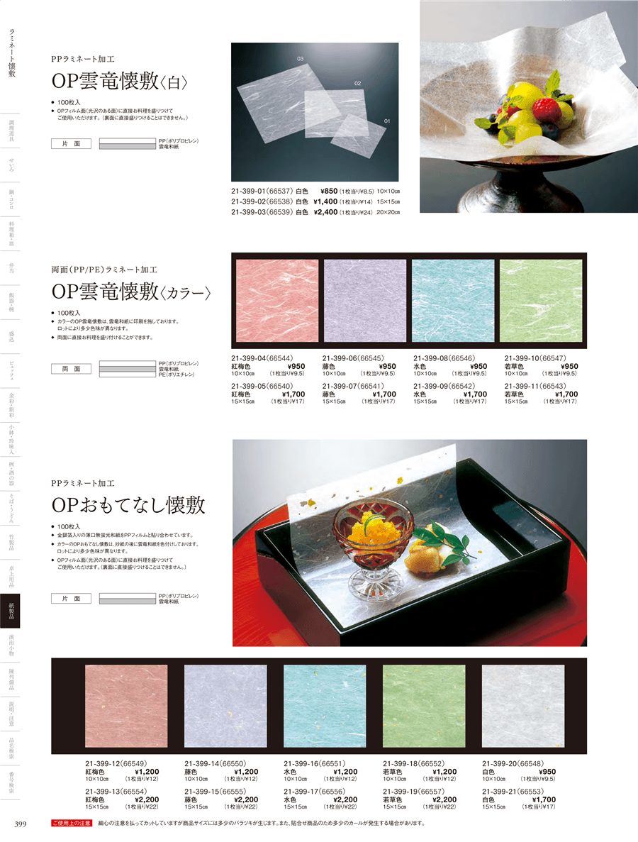| 21-399-19 | OPおもてなし懐敷 若草色 (15cm角) (100枚入) | 上代 2,200円(税抜) 卸値 1,452円(税抜) (34%OFF) | ||