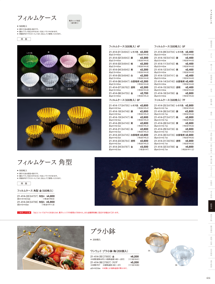 | 21-414-35 | ワンウェイ・プラ小鉢 梅 金 (200ヶ入) | 上代 8,200円(税抜) 卸値 5,412円(税抜) (34%OFF) | ||