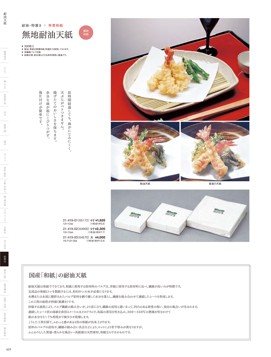 | 21-419-03 | 無蛍光和紙 耐油天紙 大 (無地) (300枚入) | 上代 4,000円(税抜) 卸値 2,640円(税抜) (34%OFF) | ||