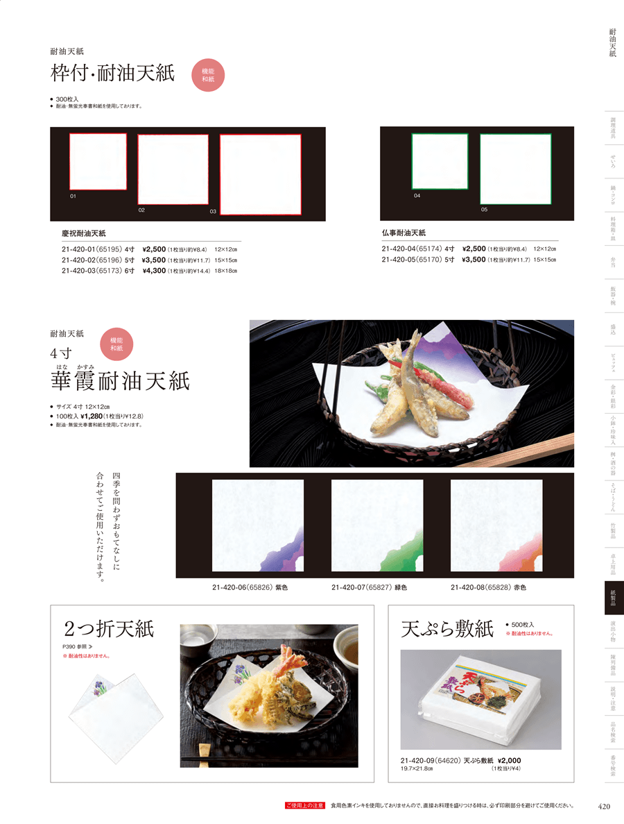 | 21-420-09 | 天ぷら敷紙 (500枚入) | 上代 2,000円(税抜) 卸値 1,320円(税抜) (34%OFF) | ||