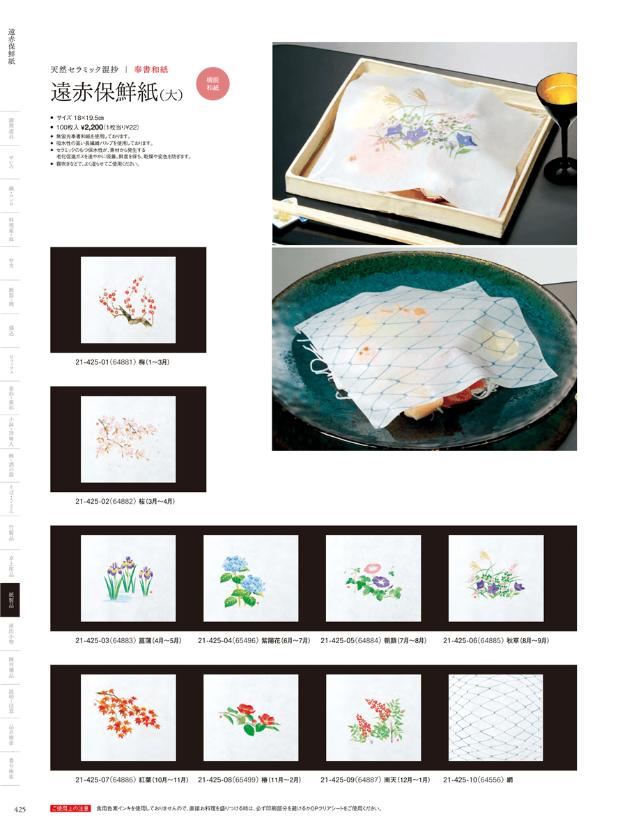 | 21-425-09 | 遠赤保鮮紙(大)南天 (100枚入) | 上代 2,200円(税抜) 卸値 1,452円(税抜) (34%OFF) | ||