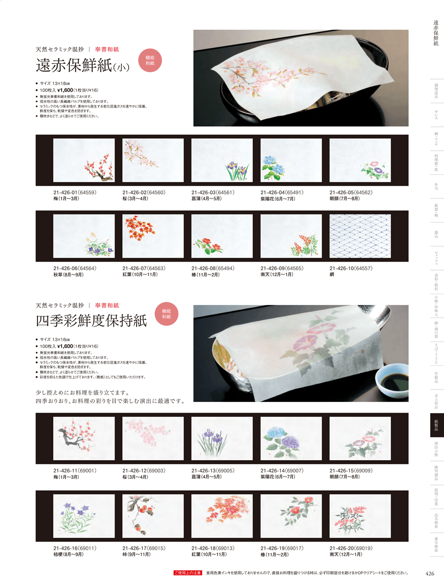 | 21-426-07 | 遠赤保鮮紙(小)紅葉 (100枚入) | 上代 1,600円(税抜) 卸値 1,056円(税抜) (34%OFF) | ||