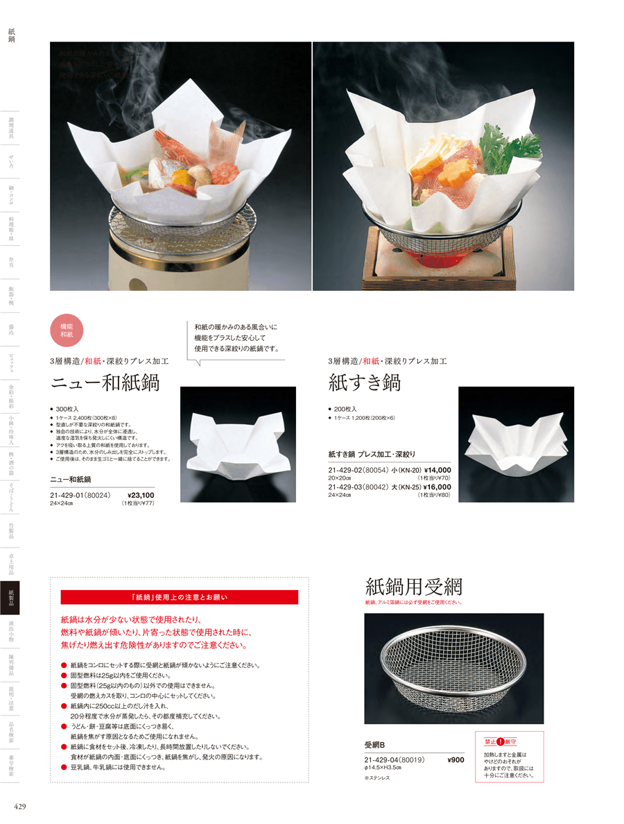 | 21-429-03 | 紙すき鍋(大) (200枚) | 上代 16,000円(税抜) 卸値 10,560円(税抜) (34%OFF) | ||