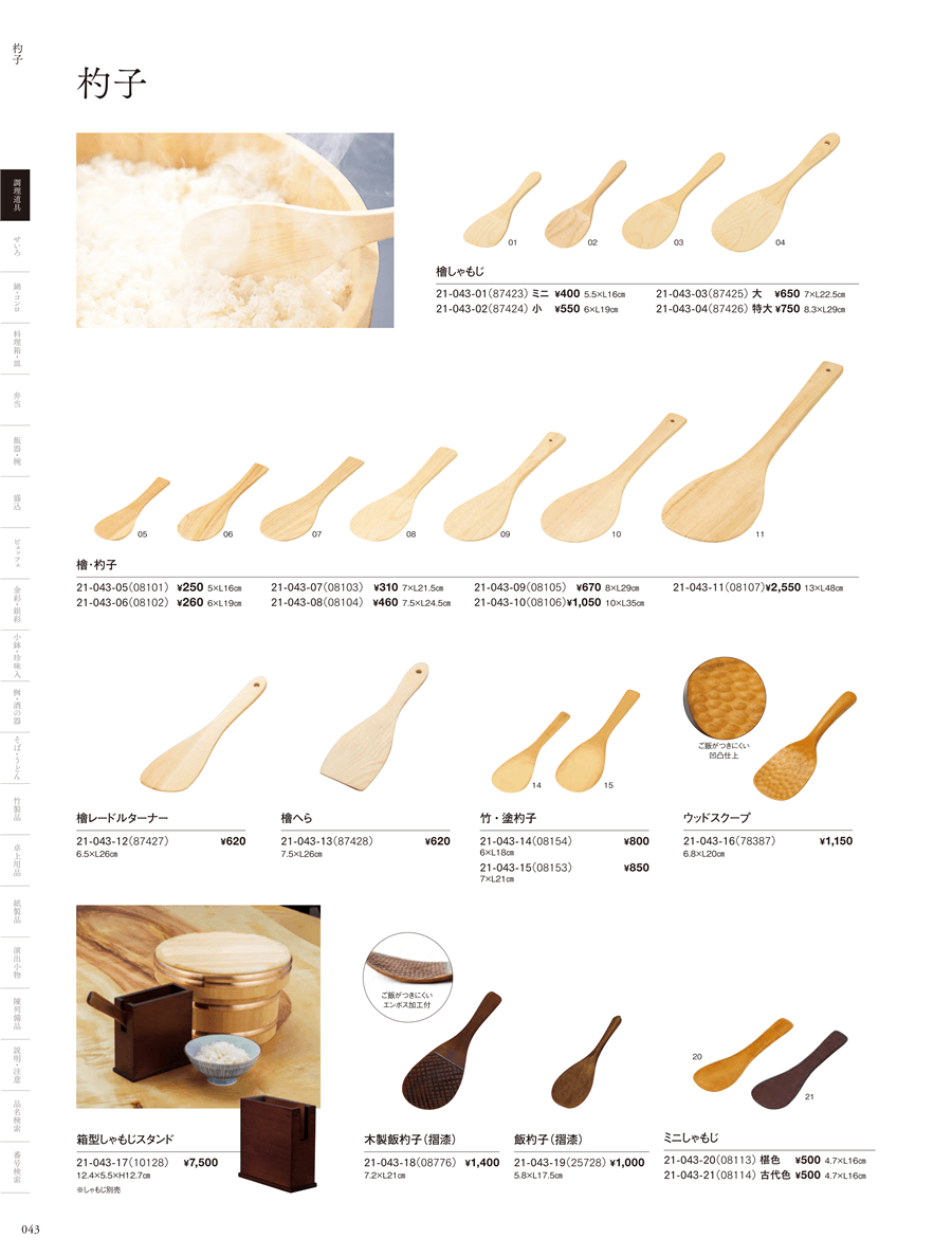 | 21-043-02 | 檜しゃもじ(小) | 上代 550円(税抜) 卸値 363円(税抜) (34%OFF) | ||