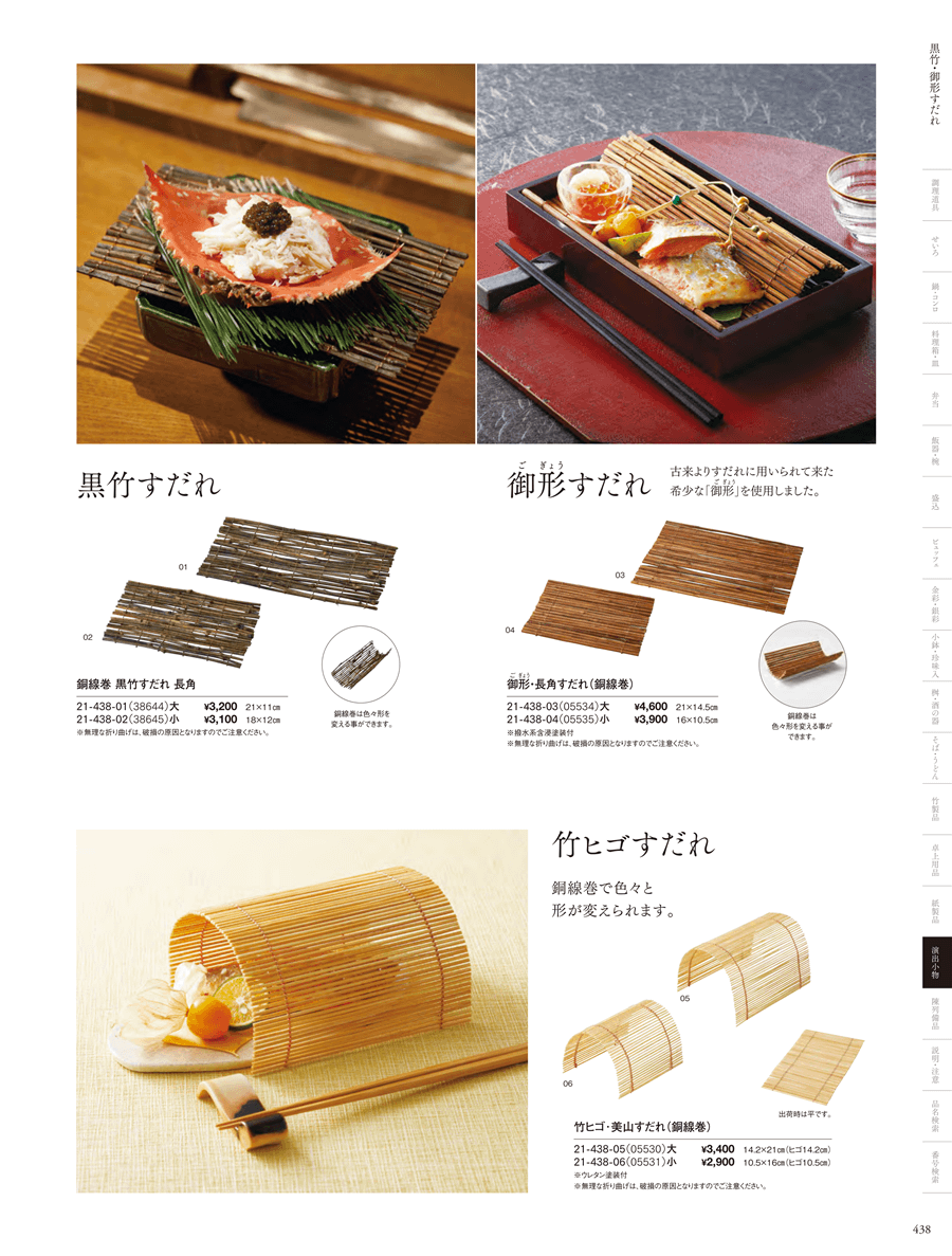 | 21-438-05 | 竹ヒゴ・美山すだれ 大 | 上代 3,400円(税抜) 卸値 2,244円(税抜) (34%OFF) | ||