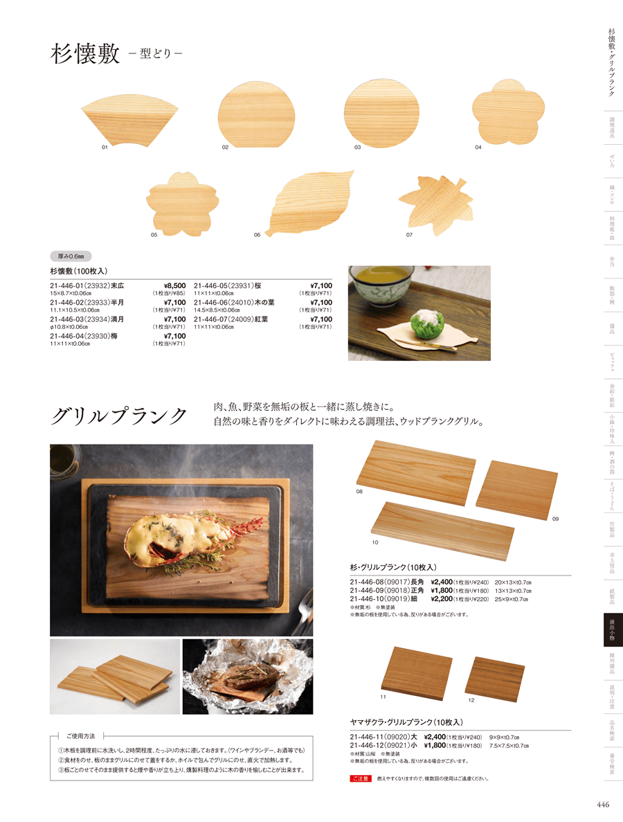 | 21-446-08 | 杉・グリルプランク(長角) 10枚入 | 上代 2,400円(税抜) 卸値 1,584円(税抜) (34%OFF) | ||
