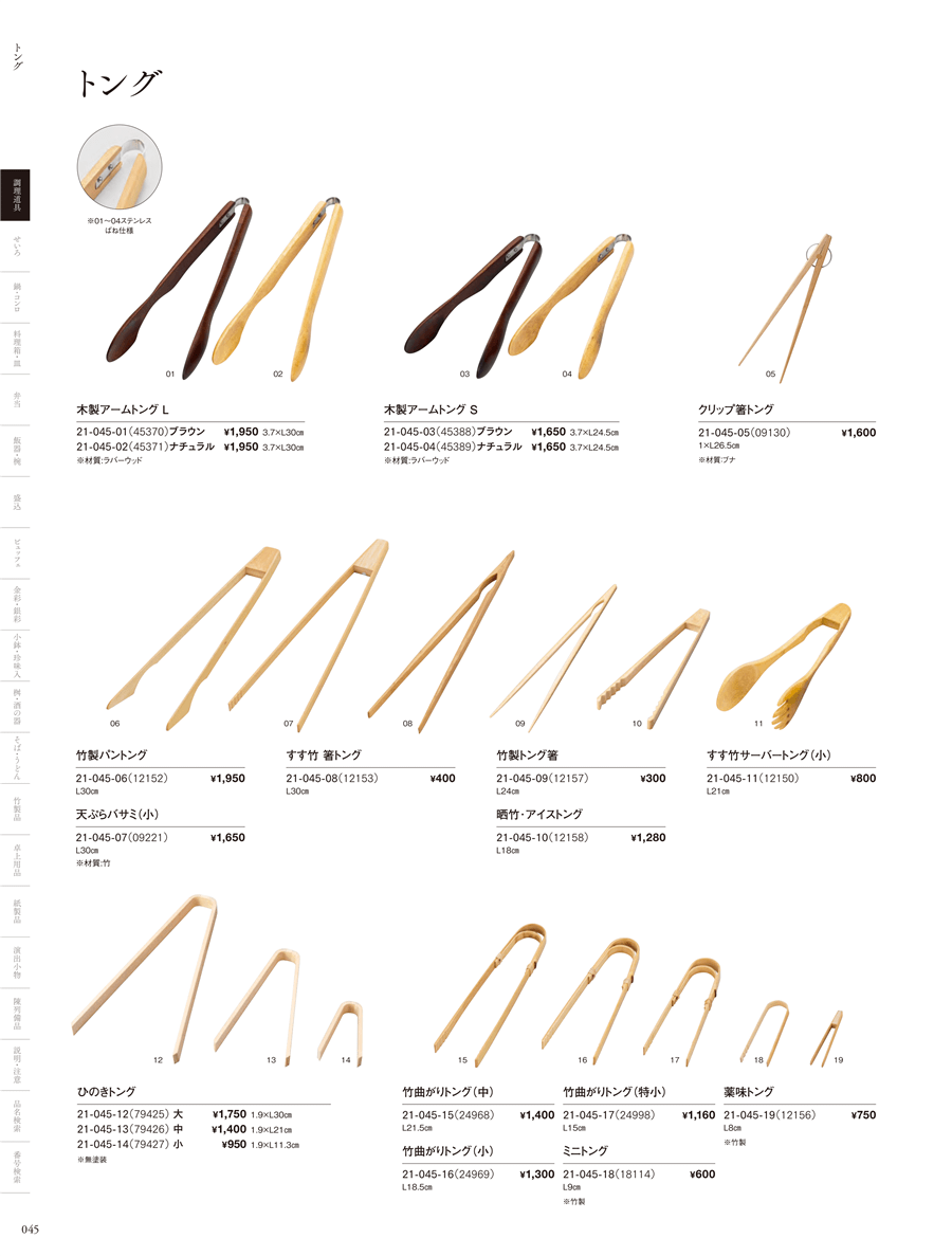 | 21-045-16 | 竹曲がりトング(小) | 上代 1,300円(税抜) 卸値 858円(税抜) (34%OFF) | ||