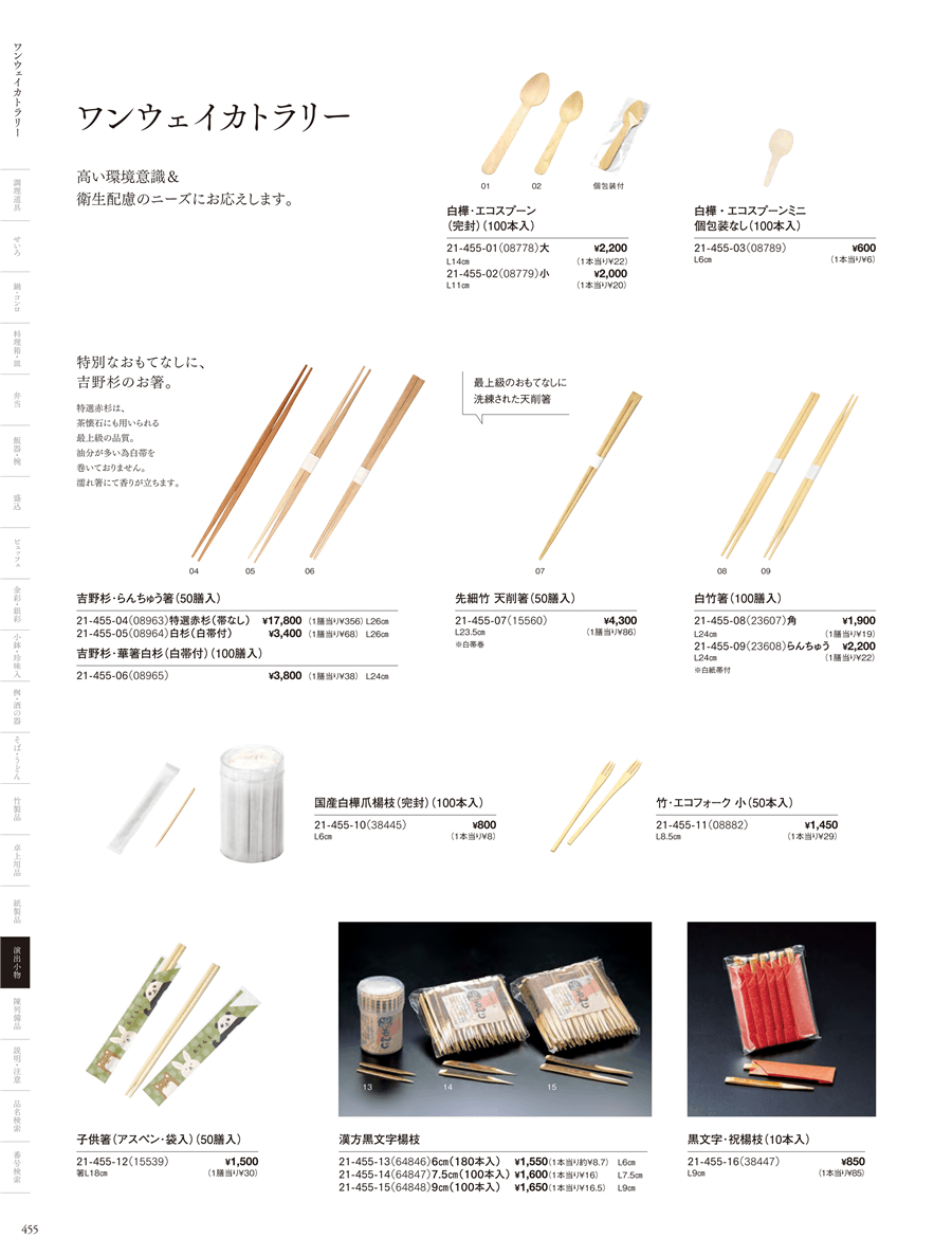 | 21-455-12 | 子供箸(アスペン・袋入) (50膳入) | 上代 1,500円(税抜) 卸値 990円(税抜) (34%OFF) | ||