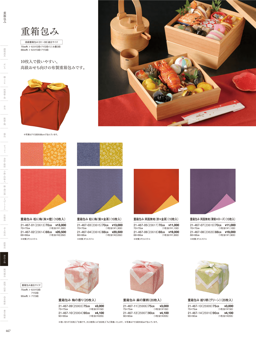 | 21-467-06 | 重箱包み 両面無地(赤x金茶) 88cm <10枚入> | 上代 19,000円(税抜) 卸値 12,540円(税抜) (34%OFF) | ||