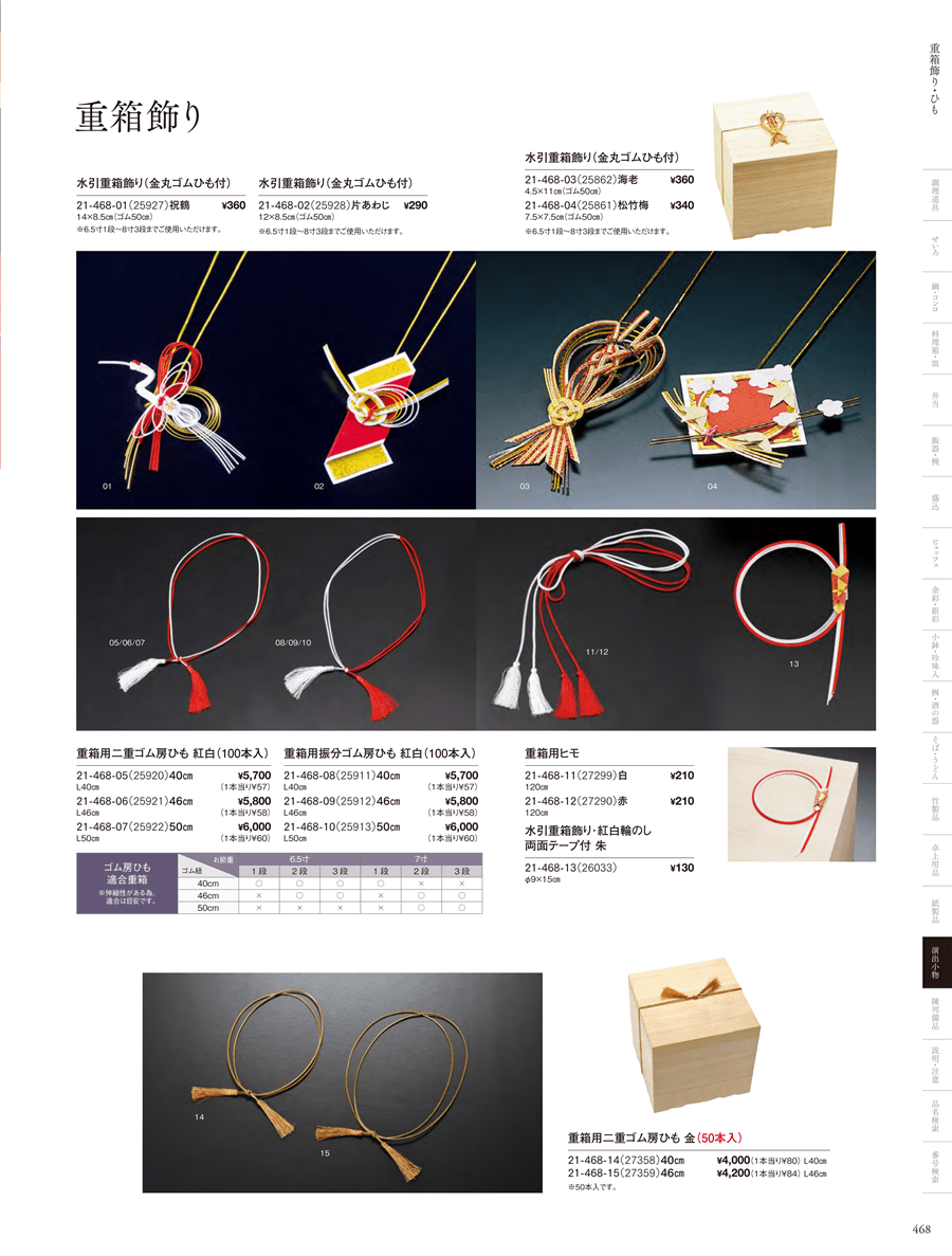 | 21-468-06 | 重箱用二重ゴム房ひも紅白46cm(100本入) | 上代 5,800円(税抜) 卸値 3,828円(税抜) (34%OFF) | ||
