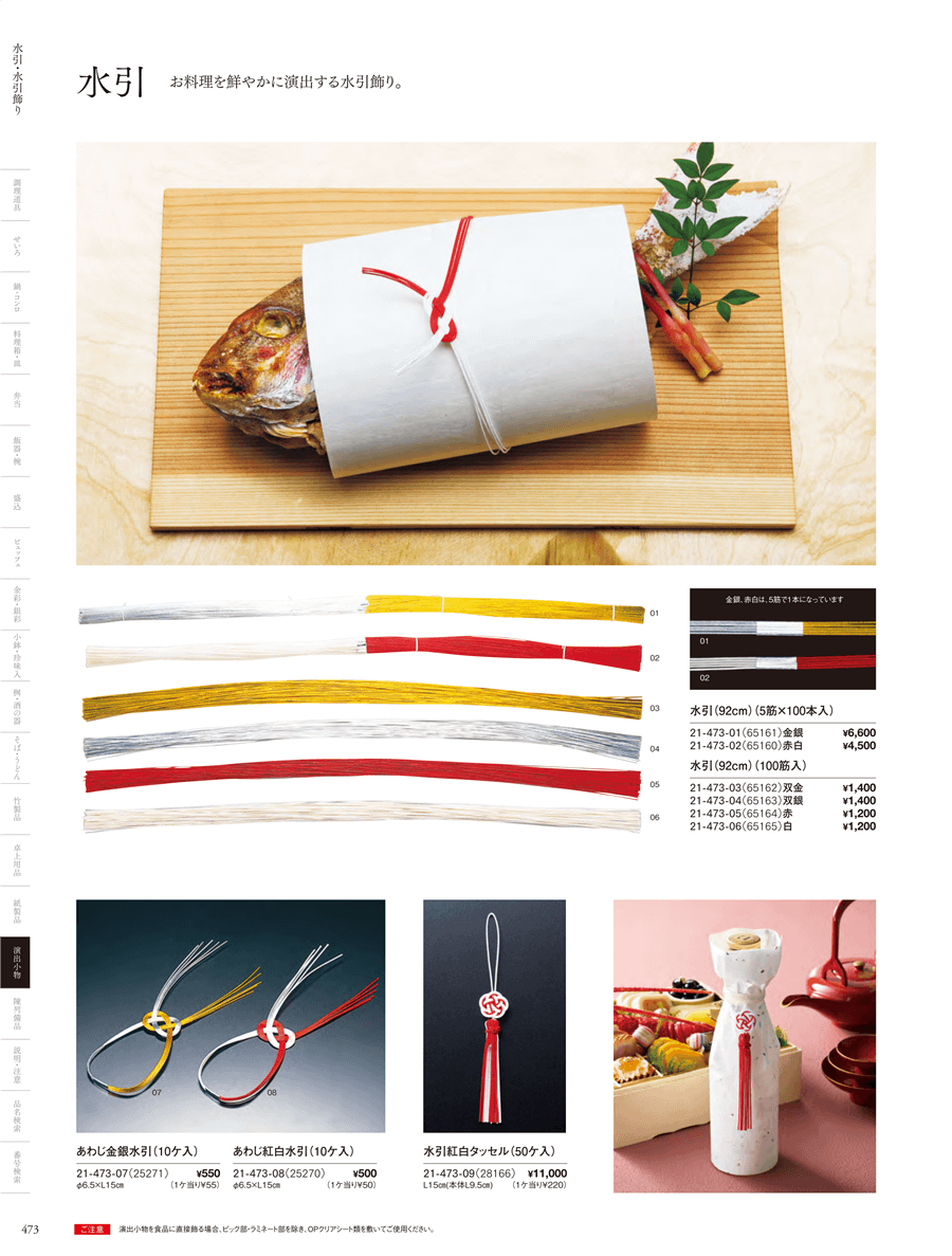 | 21-473-02 | 赤白水引 (5筋×100本) | 上代 4,500円(税抜) 卸値 2,970円(税抜) (34%OFF) | ||