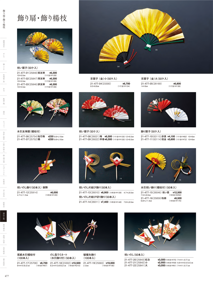 | 21-477-15 | 水引祝い飾り(楊枝付)祝い扇 (50ヶ入) | 上代 12,500円(税抜) 卸値 8,250円(税抜) (34%OFF) | ||