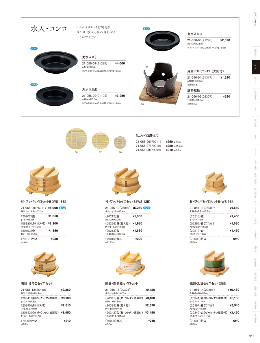 | 21-056-10 | 杉・ワッパセイロセットB(WS-12B) | 上代 5,280円(税抜) 卸値 3,485円(税抜) (34%OFF) | ||