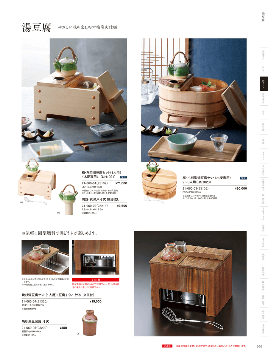 | 21-060-04 | 焼杉湯豆腐セット(1人用)*豆腐すくい・汁次・火皿付 | 上代 15,000円(税抜) 卸値 9,900円(税抜) (34%OFF) | ||