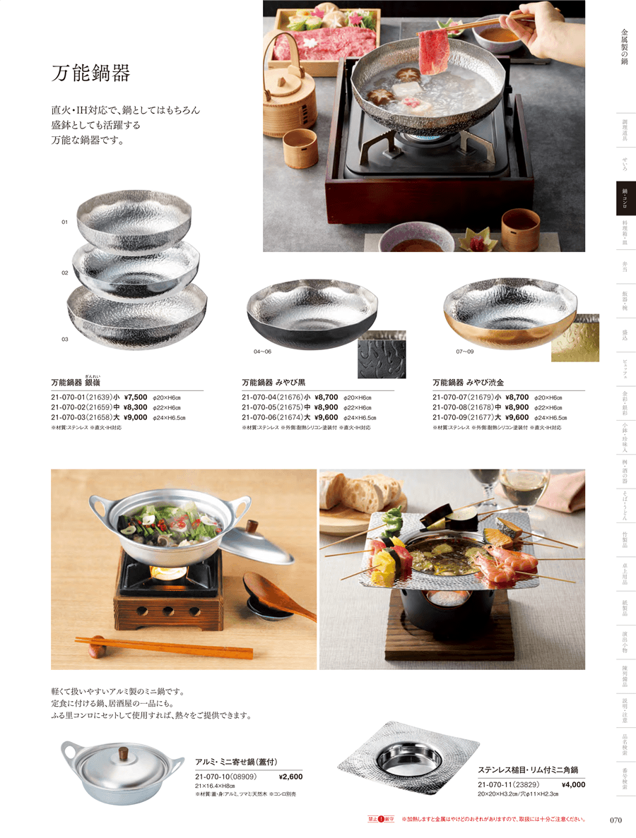 | 21-070-10 | アルミ・ミニ寄せ鍋(蓋付) | 上代 2,600円(税抜) 卸値 1,716円(税抜) (34%OFF) | ||