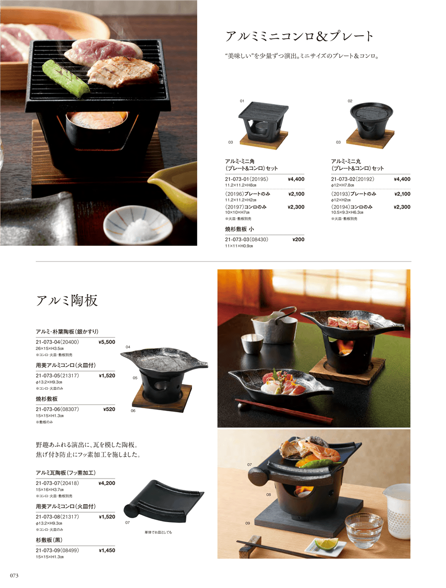 | 21-073-01 | アルミ・ミニ角(プレート&コンロ)セット | 上代 4,400円(税抜) 卸値 2,904円(税抜) (34%OFF) | ||