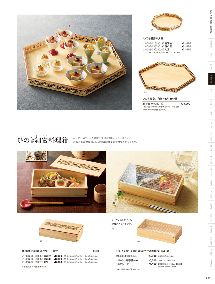 | 21-086-06 | ひのき細密料理箱 クリアー蓋付 麻の葉 | 上代 8,800円(税抜) 卸値 5,808円(税抜) (34%OFF) | ||