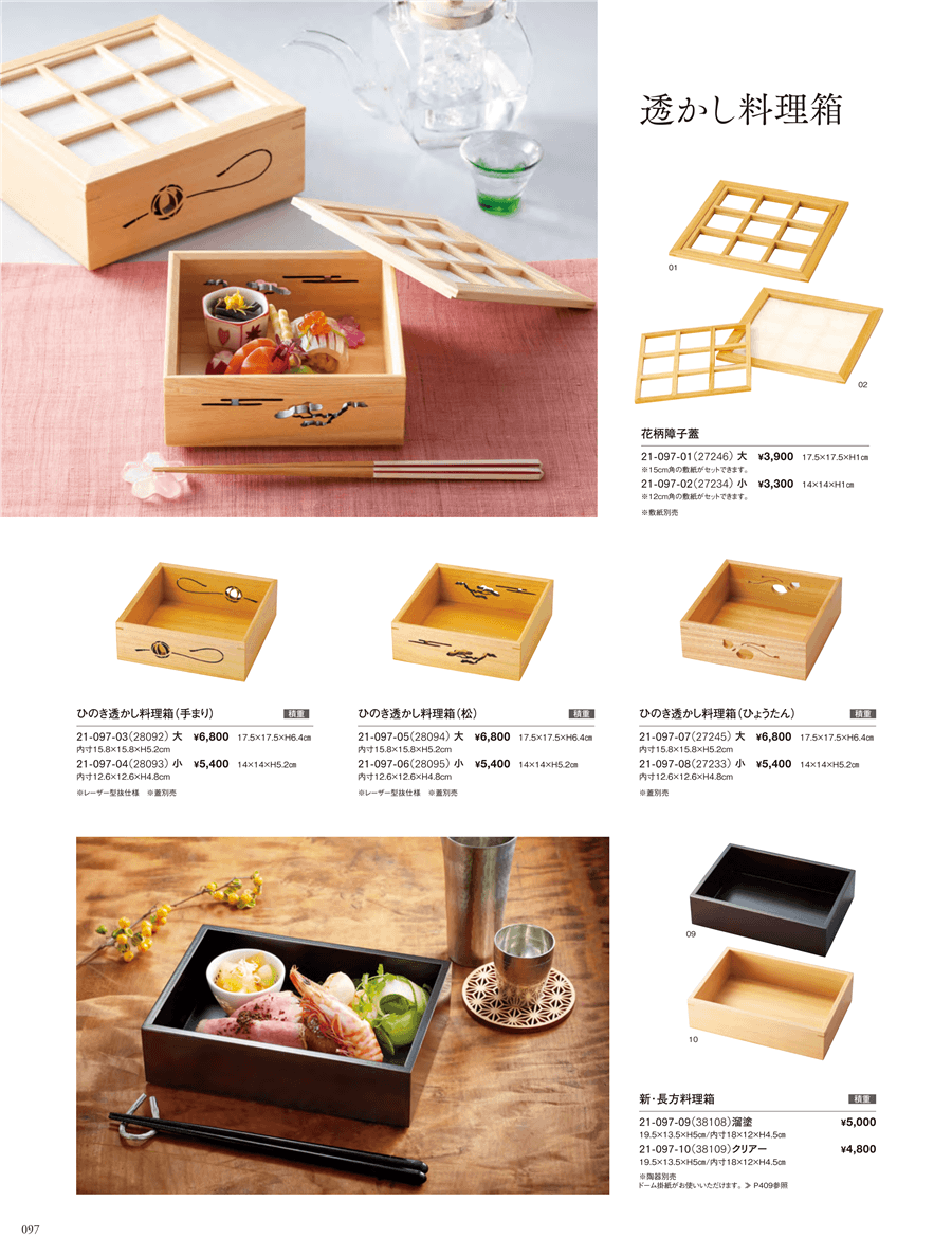 | 21-097-05 | ひのき・透かし料理箱 (松)大 | 上代 6,800円(税抜) 卸値 4,488円(税抜) (34%OFF) | ||