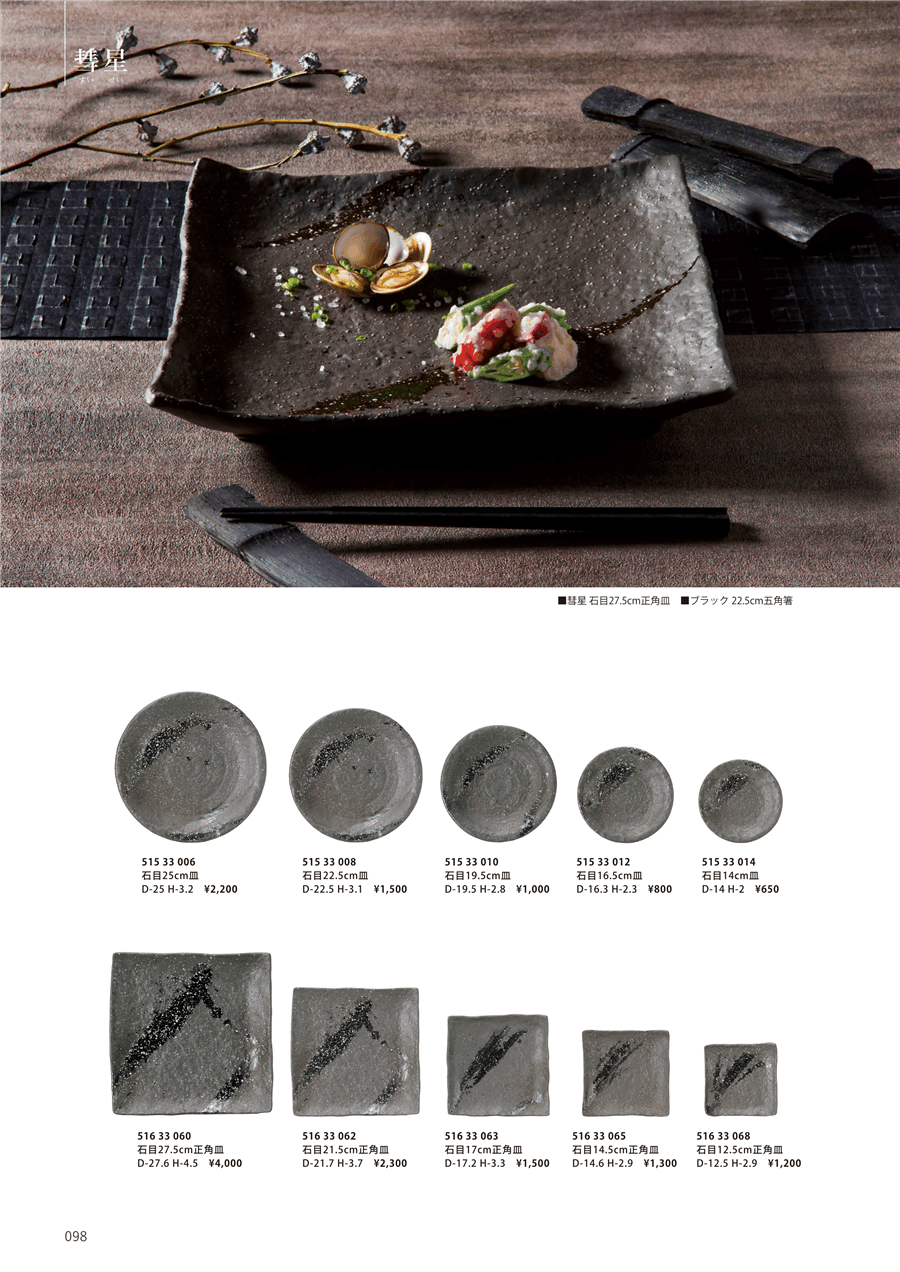 | kd12-51633068 | 彗星 石目12.5cm正角皿 | 上代 1,200円(税抜) 卸値 600円(税抜) (50%OFF) | ||