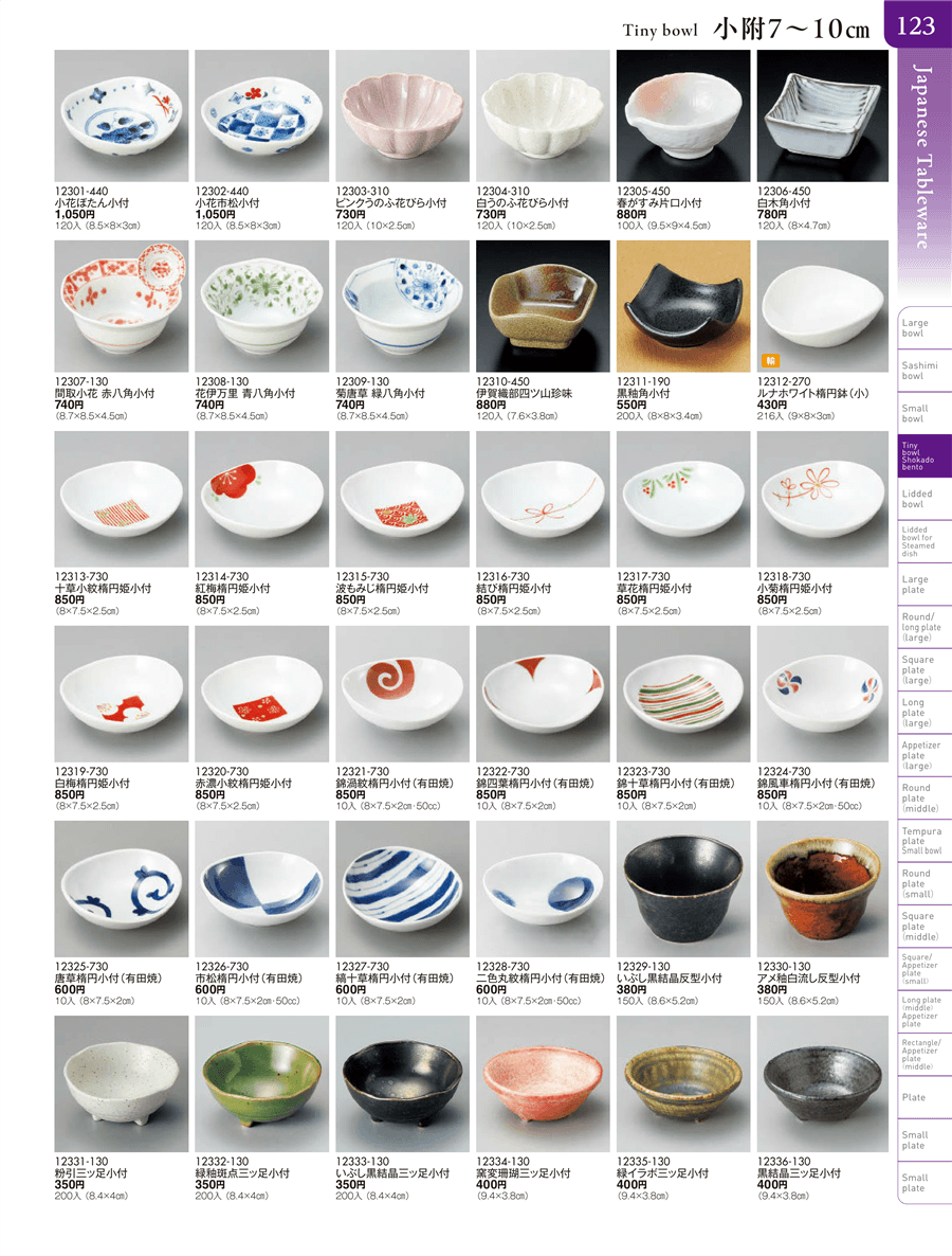 | 12328-730 | 二色丸紋楕円小付(有田焼) | 上代 600円(税抜) 卸値 330円(税抜) (45%OFF) | ||