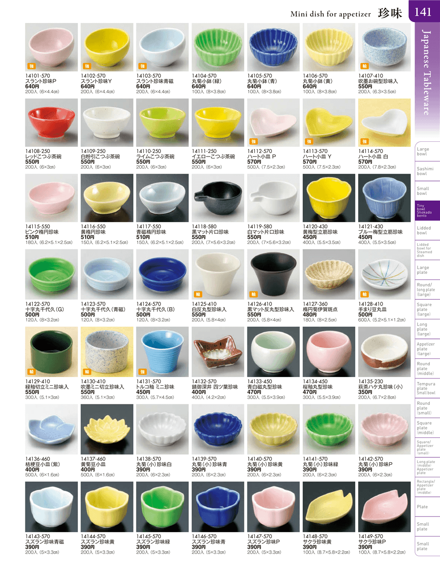 | 14130-410 | 吹墨ミニ切立珍味入 | 上代 550円(税抜) 卸値 303円(税抜) (45%OFF) | ||