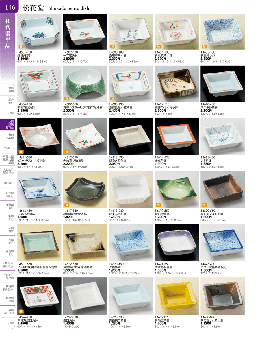 | 14630-020 | 明志野リム角小鉢 | 上代 1,120円(税抜) 卸値 616円(税抜) (45%OFF) | ||