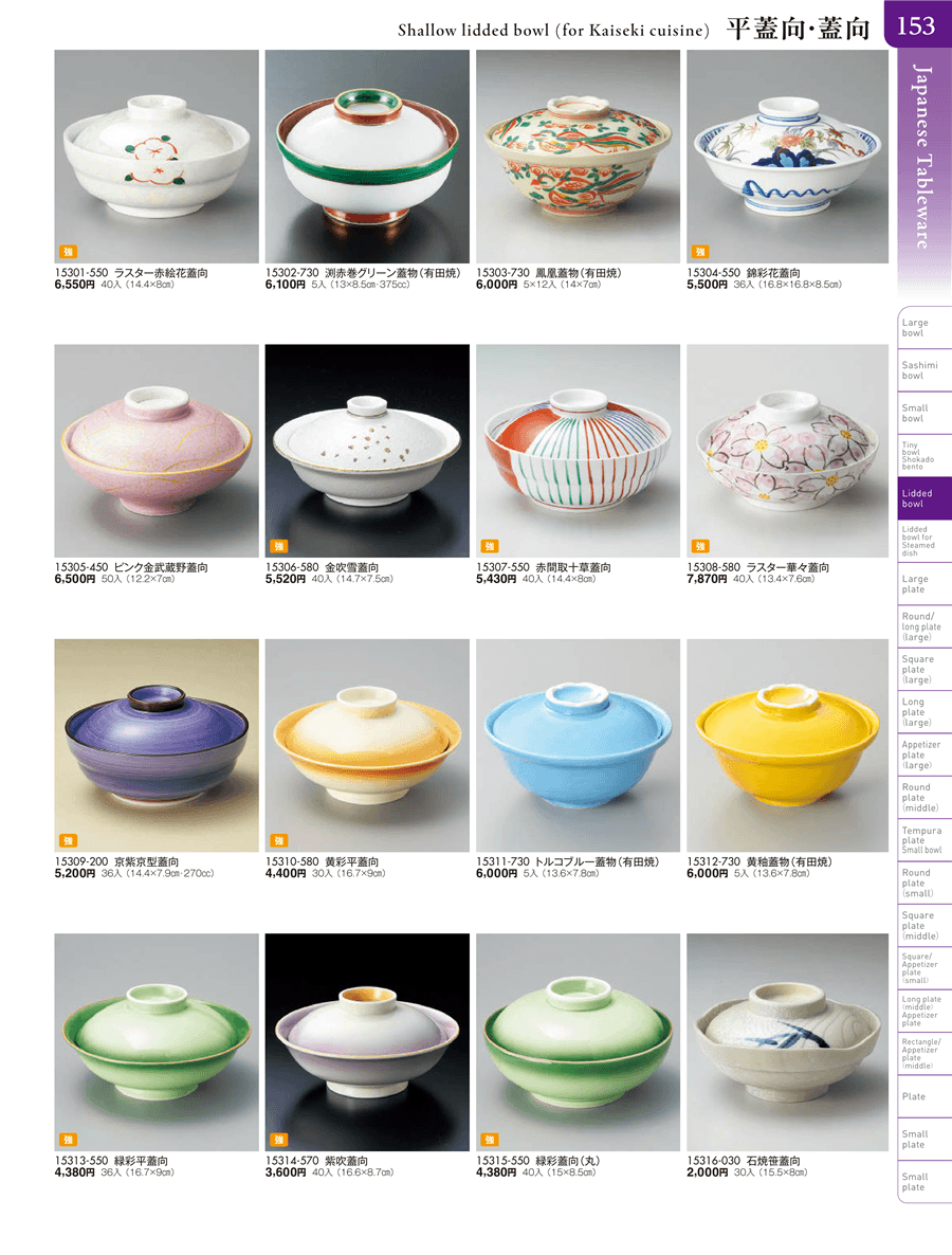 | 15315-550 | 緑彩蓋向(丸) | 上代 4,380円(税抜) 卸値 2,409円(税抜) (45%OFF) | ||