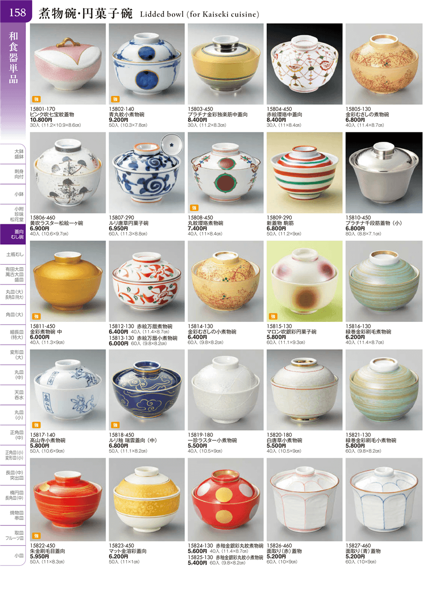 | 15811-450 | 金彩煮物碗 中 | 上代 6,000円(税抜) 卸値 3,301円(税抜) (45%OFF) | ||