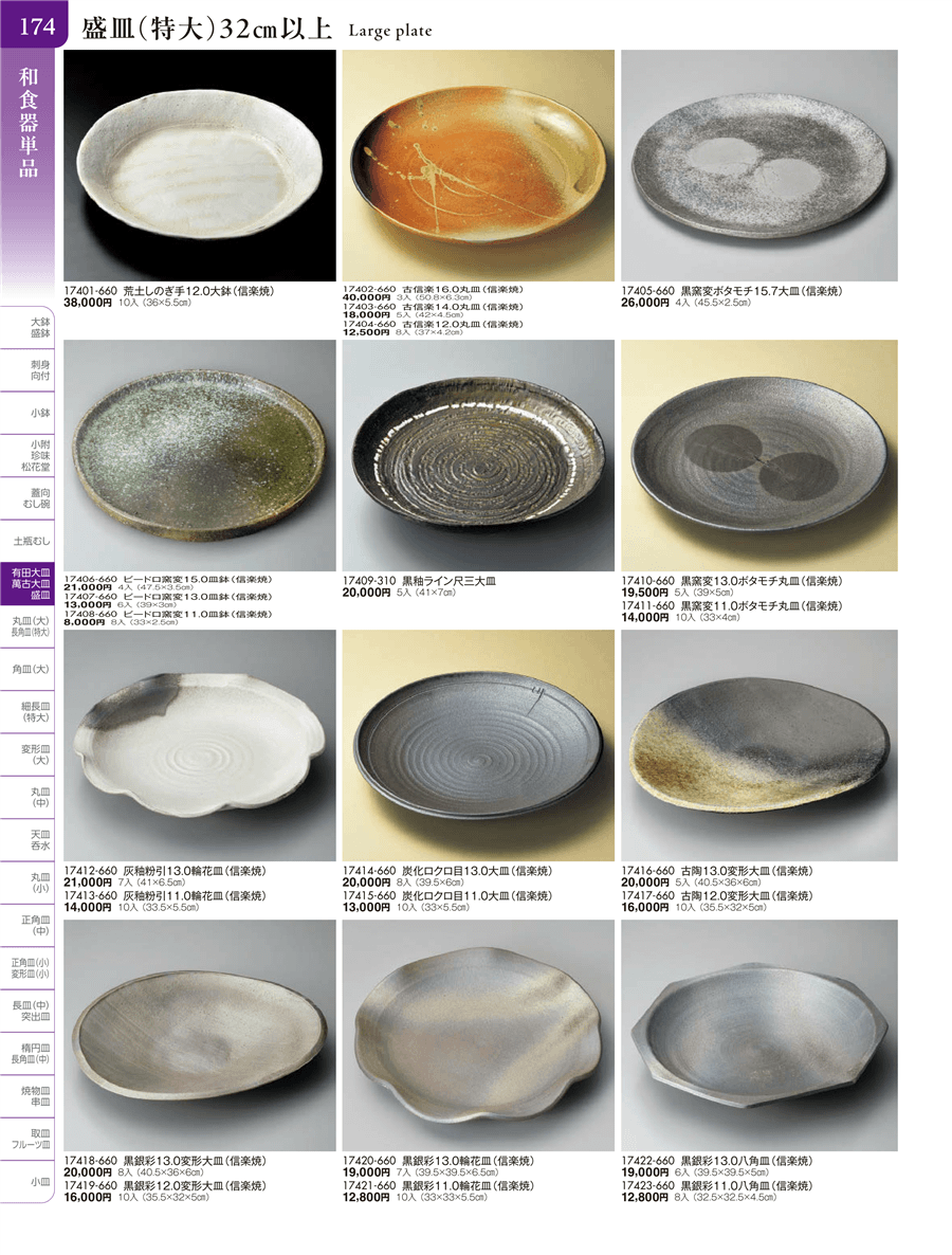 | 17417-660 | 古陶12.0変形大皿(信楽焼) | 上代 16,000円(税抜) 卸値 8,800円(税抜) (45%OFF) | ||