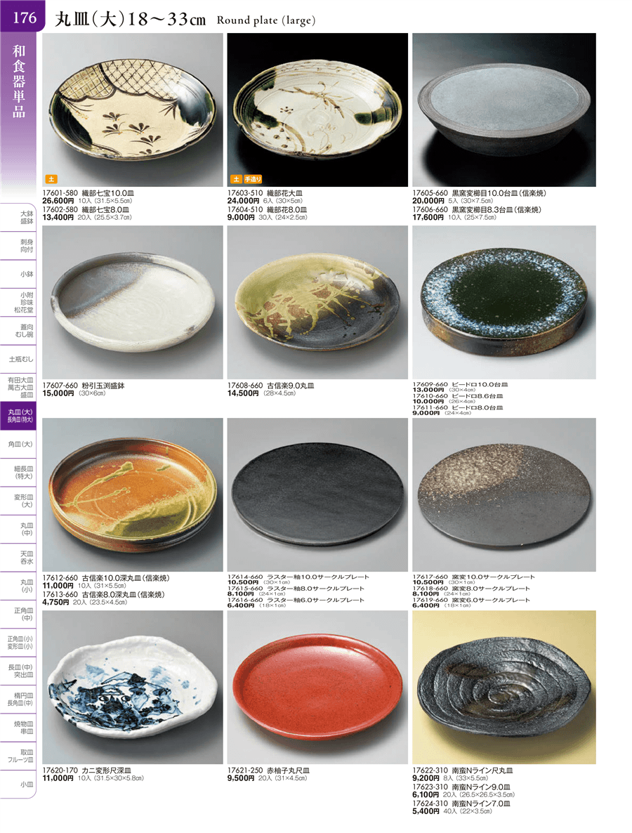 | 17608-660 | 古信楽9.0丸皿 | 上代 14,500円(税抜) 卸値 7,976円(税抜) (45%OFF) | ||