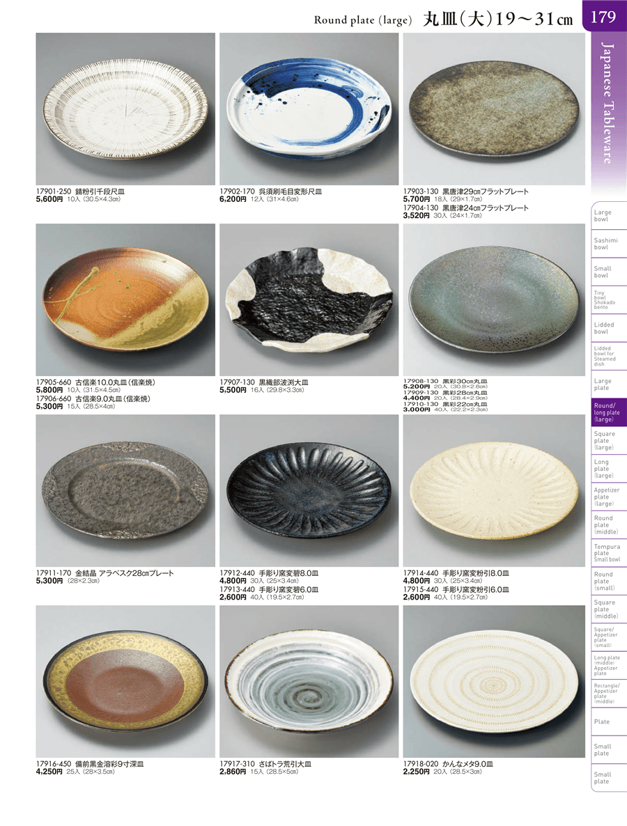 | 17908-130 | 黒彩30㎝丸皿 | 上代 5,200円(税抜) 卸値 2,861円(税抜) (45%OFF) | ||