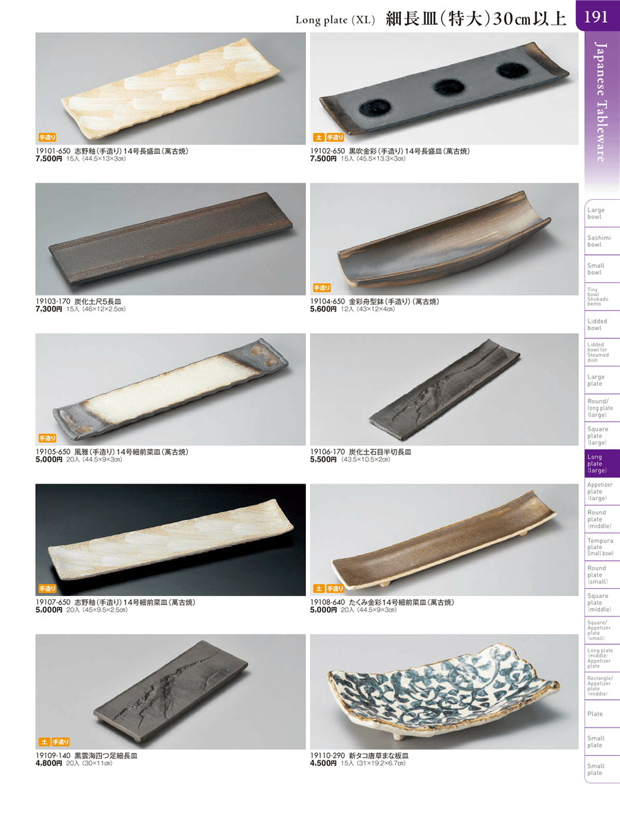 | 19106-170 | 炭化土石目半切長皿 | 上代 5,500円(税抜) 卸値 3,026円(税抜) (45%OFF) | ||