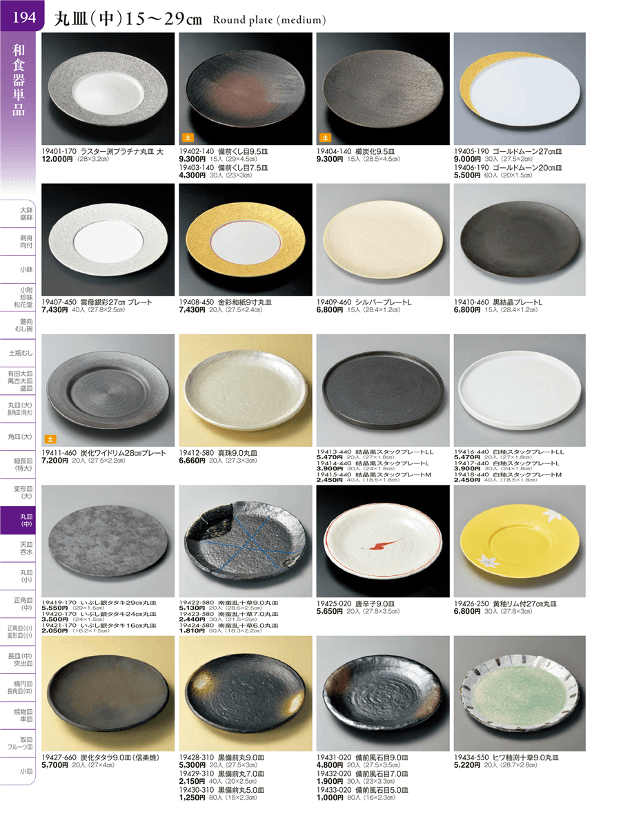 | 19404-140 | 櫛炭化9.5皿 | 上代 9,300円(税抜) 卸値 5,115円(税抜) (45%OFF) | ||