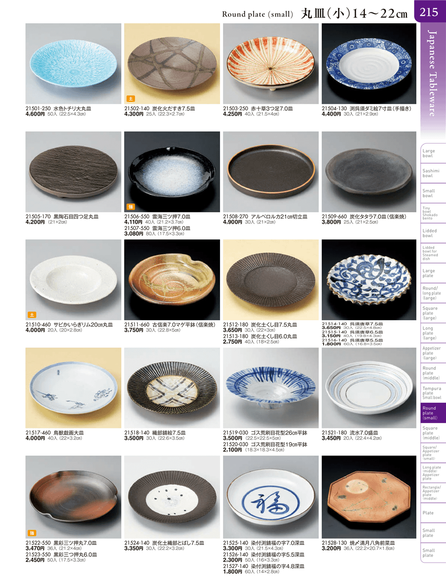 | 21512-180 | 炭化土くし目7.5丸皿 | 上代 3,650円(税抜) 卸値 2,008円(税抜) (45%OFF) | ||