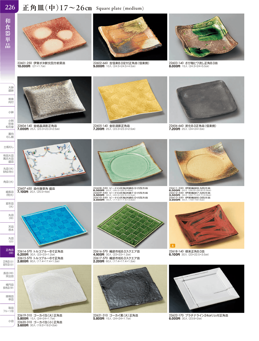 | 22613-550 | 伊賀織部6.0四方皿 | 上代 3,000円(税抜) 卸値 1,651円(税抜) (45%OFF) | ||