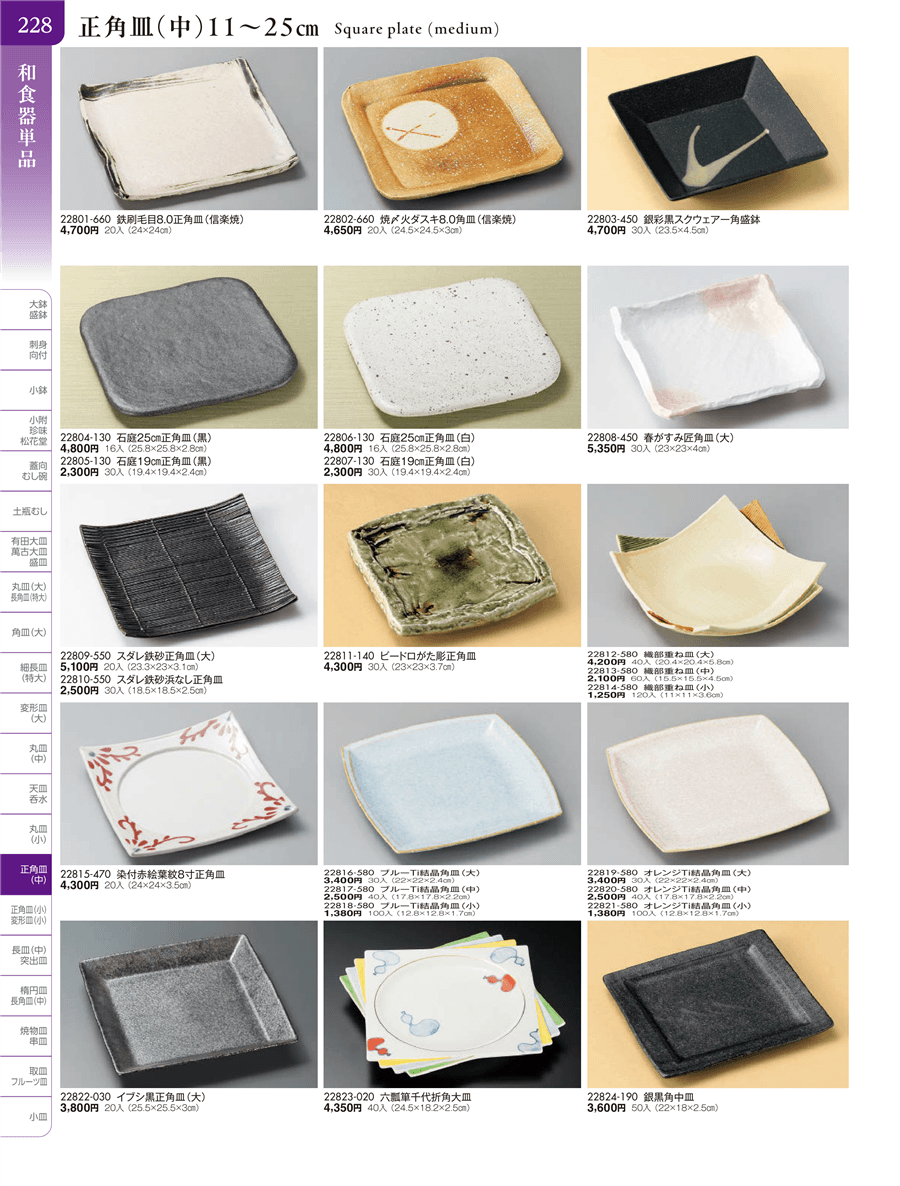 | 22801-660 | 鉄刷毛目8.0正角皿(信楽焼) | 上代 4,700円(税抜) 卸値 2,585円(税抜) (45%OFF) | ||