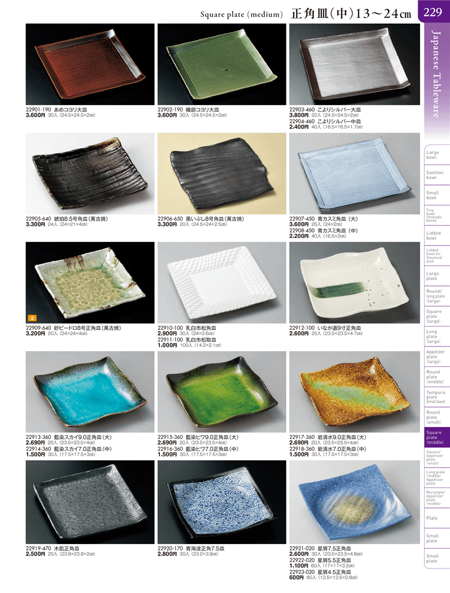 | 22912-100 | いなか道9寸正角皿 | 上代 2,600円(税抜) 卸値 1,431円(税抜) (45%OFF) | ||