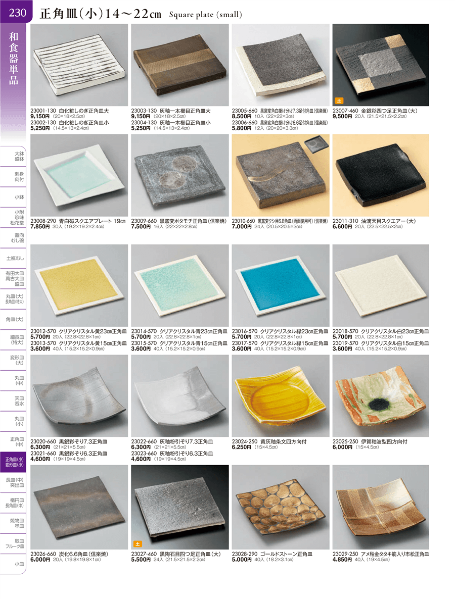 | 23002-130 | 白化粧しのぎ正角皿小 | 上代 5,250円(税抜) 卸値 2,888円(税抜) (45%OFF) | ||