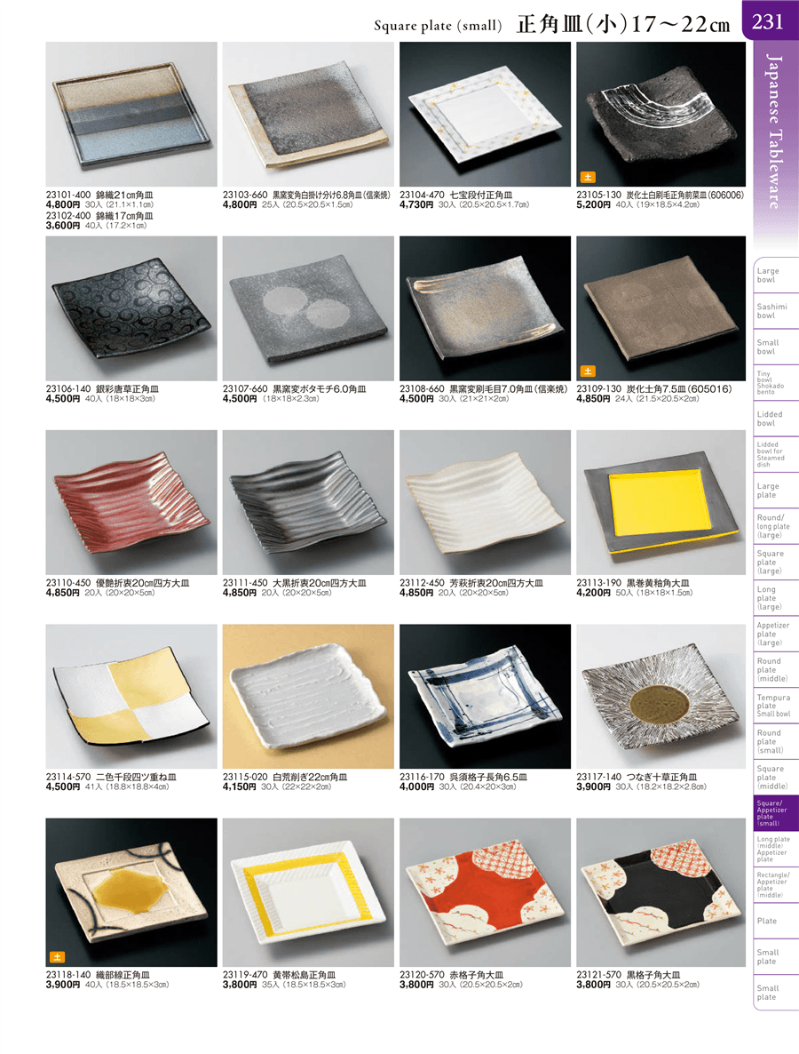 | 23105-130 | 炭化土白刷毛正角前菜皿(606006) | 上代 5,200円(税抜) 卸値 2,861円(税抜) (45%OFF) | ||