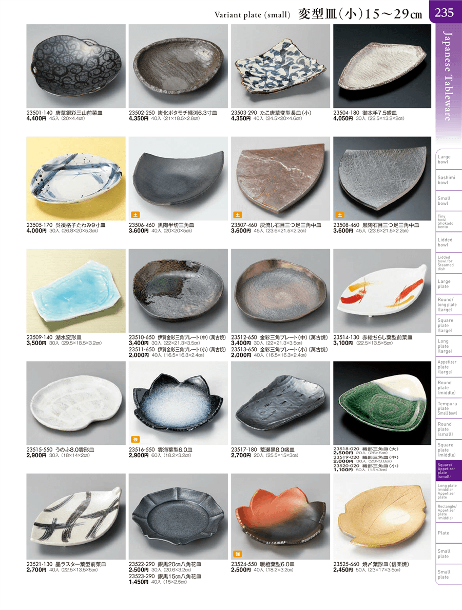 | 23506-460 | 黒陶半切三角皿 | 上代 3,600円(税抜) 卸値 1,981円(税抜) (45%OFF) | ||